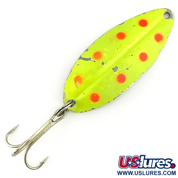 Con una longitud de 5,5 cm, el cuerpo de metal troquelado de esta creación de TODDCO presenta una cresta central distintiva que define su silueta ovalada alargada. Este Main liner UV, catalogado bajo el código de producto 6878, representa la fabricación estadounidense de aparejos de la era que finalizó en 1980. El acabado consiste en una vibrante pintura fluorescente amarilla decorada con brillantes puntos rojos sobre una base de níquel macizo. Cuando se somete a la luz UV, el pigmento amarillo transiciona a un vívido brillo verde neón, mientras que los detalles circulares rojos permanecen oscuros para una visibilidad de alto contraste. Con una calificación de estado de 4/5, el espécimen muestra signos honestos de uso con pequeñas pérdidas de pintura a lo largo de los bordes y la línea central elevada, revelando el sustrato de níquel pulido. Tiene un peso de 12,5 g, equilibrado para técnicas tradicionales de lanzado o curricán. El montaje incluye un anzuelo triple afilado sujeto por un anilla abierta en la cola y un ojal de fijación limpio en el morro.