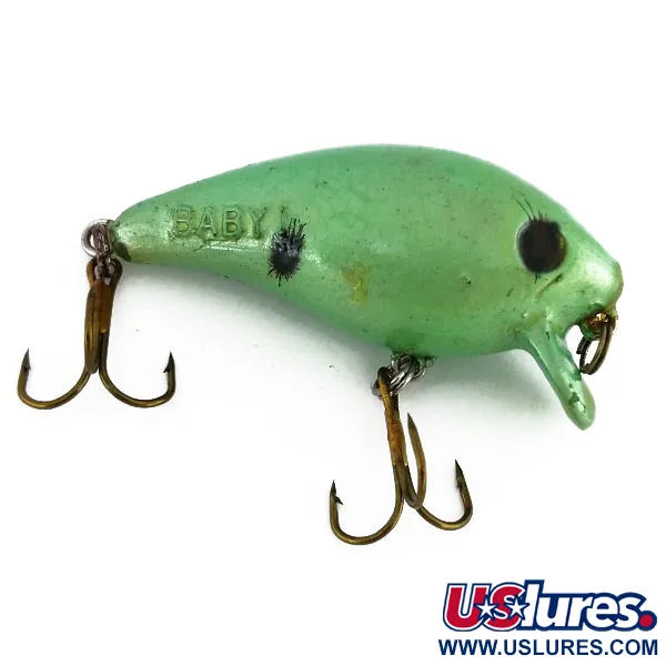 Un peso de 1/4 oz (7 g) le da a este shallow-runner el peso necesario para lances precisos en coberturas densas. Con una medida de 2 1/4" (6 cm), el señuelo cuenta con un acabado nacarado Green / Black y el distintivo sello en relieve "BABY" en el flanco. Mann's Bait diseñó este modelo para mantenerse en la capa superior de la columna de agua, alcanzando una profundidad máxima de solo 0,3 m (1 ft). El diseño incluye un patrón de ojos único con finas líneas radiales y un solo punto negro lateral típico de las series vintage de USA. Se conserva todo el hardware original, incluyendo dos robustos anzuelos triples y una anilla abierta, lo que le otorga una calificación de estado de 5/5. El código 9711 está moldeado con un babero corto y pronunciado que limita su descenso manteniendo una flotabilidad positiva.