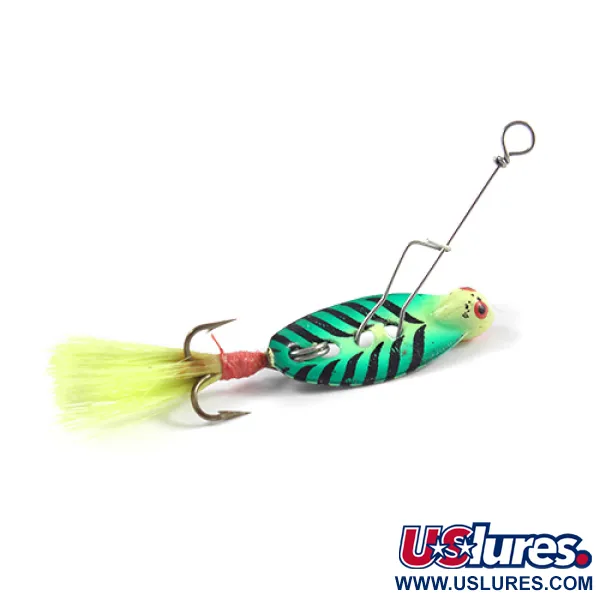 Los patrones Fire Tiger en el cuerpo en forma de lágrima proporcionan una alta visibilidad, utilizando rayas negras marcadas sobre un degradado verde y amarillo vibrante. Este ejemplar de Mann's Bait, catalogado con el código de producto 2434, se encuentra en excelente estado 5/5, con los herrajes y la pintura conservando su aspecto original de fábrica. Con un peso de 1/8oz (4g), el diseño se basa en un armazón de alambre y una hoja metálica que produce un movimiento tembloroso para generar vibraciones. La cola está equipada con un anzuelo triple con plumas, donde hebras amarillas brillantes están sujetas firmemente con una envoltura de hilo rojo. Originario de USA, el señuelo presenta un perfil de cabeza distintivo con ojos rojos pintados que sirven como punto de ataque. El armazón está diseñado para permitir una presentación constante, manteniendo la línea alejada del cuerpo vibrante durante el uso.