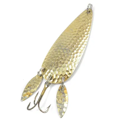 Una textura de oro martillado define el cuerpo en forma de lágrima de esta cucharilla americana vintage. Con dos pequeñas "Sonic Blades" unidas a la cola junto al anzuelo triple, esta Marathon 2 (código de producto 2080) ofrece un perfil complejo para lance o curricán. La empresa Marathon de los USA fabricó estos señuelos con una base de latón macizo, visible en el reverso liso. Con un peso de 14g (1/2oz) y una medida de 7cm (2 3/4"), el señuelo conserva un acabado brillante y reflectante en su superficie texturizada. Los herrajes se mantienen robustos, incluidos los anillas de llavero que sujetan las palas auxiliares. Este ejemplar está en condición 4/5, mostrando un desgaste superficial muy leve y pequeñas marcas de almacenamiento.