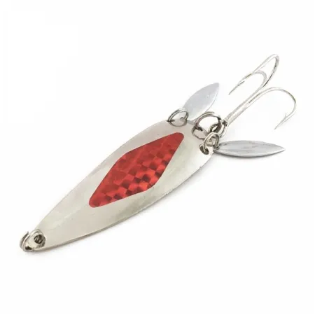 Dos pequeñas paletas plateadas siguen al cuerpo cromado, proporcionando destellos adicionales y movimiento visual justo en la zona de picada. La superficie reflectante cuenta con un inserto de textura de «escama de diamante» roja centrado en el lado convexo para una alta visibilidad bajo el agua. Con 3" (7,5 cm) de largo y un peso de 3/5 oz (17 g), la distribución del peso es ideal para lanzamientos de larga distancia o curricán constante. Este diseño fue producido por Marathon Bait Company entre 1929 y 1979 para combinar el perfil de una cucharilla ondulante con la vibración de paletas secundarias. Este espécimen muestra una condición de 5/5, con el acabado reflectante y la calcomanía de escamas rojas limpios e intactos. Código de producto 24602.