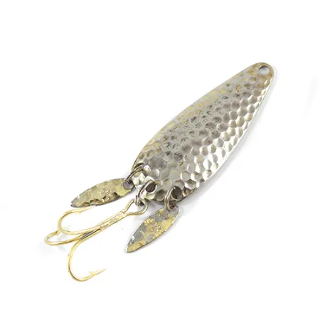 Un acabado en oro martilleado define la cara de esta cucharilla ondulante de 6 cm (2 1/4"), un diseño clásico de Marathon Bait Company. Identificado con el código de producto 2772, el señuelo se distingue por sus 'Sonic Blades': dos pequeñas gotas de metal unidas a la anilla abierta trasera que proporcionan un destello adicional junto al anzuelo triple de tono dorado. Con un peso de 12 g (2/5 oz), el cuerpo de metal macizo presenta un interior liso y pulido donde el nombre del fabricante está estampado en una fuente limpia sin remates. El estado está calificado con un 4/5, mostrando una superficie bien cuidada que conserva su brillo original e integridad estructural. Un único orificio en el extremo estrecho permite la fijación directa de la línea o un clip, típico de los herrajes de mediados de siglo que se encuentran en muchas cajas de aparejos de los Grandes Lagos.