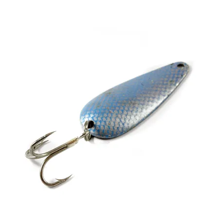 Un distintivo acabado de escamas azul y níquel cubre el lado convexo de esta cucharilla ondulante de 6 cm (2 1/4"), ofreciendo un aspecto texturizado que fue un elemento básico para los pescadores de Wisconsin durante décadas. El estampado en el reverso de níquel la identifica como una Marathon genuina, producida por la Marathon Bait Company que fabricó señuelos en los EE. UU. entre 1929 y 1979. Con un peso de 9 g (1/3 oz), la cucharilla conserva su triple original y lleva el código de producto 3015. Su estado 4/5 se caracteriza por un ligero desgaste superficial que revela el cuerpo de níquel brillante bajo la pintura de escamas azul, manteniendo intacto el carácter vintage mientras el metal permanece limpio. Las letras grabadas en la parte posterior siguen siendo nítidas, proporcionando un vínculo claro con la larga historia de producción de aparejos de la empresa en el Medio Oeste estadounidense.