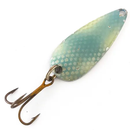Un distintivo patrón de escamas en nido de abeja azul claro cubre el lado convexo de esta cucharilla clásica, un diseño característico de Marathon Bait Company. Con una medida de 4,5 cm (1 3/4") y un peso de 5,5 g (3/16 oz), este ejemplar de mediados de siglo representa el apogeo de la historia de la fabricación de señuelos en Wisconsin. Al darle la vuelta al señuelo, se revela un acabado niquelado limpio estampado con el nombre "MARATHON" en un elegante arco, que lo identifica como código de producto 4161. La empresa operó en Wausau, Wisconsin, de 1929 a 1979, y piezas como esta muestran por qué siguieron siendo un referente durante cincuenta años. El hardware incluye un sólido anilla abierta unido a un anzuelo triple vintage que muestra ligeros signos de su edad. La condición está calificada como 4/5, conservando la mayor parte de su pintura original y superficie reflectante. Fue diseñada para lances ligeros o curricán, donde la forma de lágrima de la cucharilla y la distribución del peso le permitían mantenerse a gran profundidad en la columna de agua.