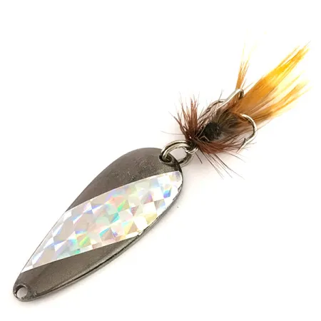 Con un peso exacto de 1/4 oz (7 g), esta cucharilla ondulante en forma de lágrima presenta un acabado metálico gris oscuro que contrasta con un llamativo inserto holográfico de diamantes. Marathon Bait Company, que operó en Wisconsin desde 1929 hasta 1979, estampó su nombre claramente en el reverso del cuerpo de 1 3/4" (4,5 cm). Identificado con el código de producto 7529, el señuelo está equipado con un anzuelo adornado con un penacho de plumas marrones y amarillas bien conservado. El estado es excelente, con una calificación de 5/5, mostrando la claridad original de la cinta prismática. Este ejemplar fabricado en EE. UU. conserva sus herrajes originales y sus plumas montadas de fábrica, reflejando los estándares de fabricación de su época.