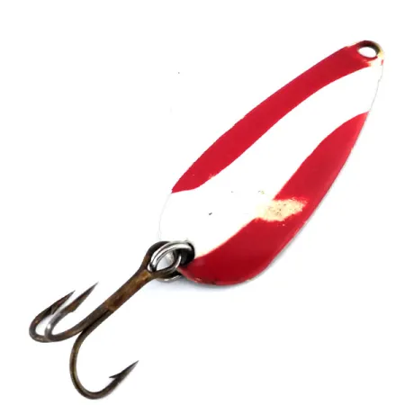 Rayas diagonales de esmalte rojo y blanco definen la cara de esta cucharilla ondulante vintage, un diseño emblemático fabricado por la Marathon Bait Company en Wisconsin entre 1929 y 1979. Con el nombre de la marca grabado claramente en el reverso niquelado, el cuerpo metálico de 1 3/4" (4,5 cm) representa una era clásica de la fabricación de artículos de pesca estadounidenses. Este ejemplar, identificado con el código de producto 9942, pesa 1/4oz (7g) y presenta la tradicional forma de lágrima, utilizada a menudo tanto para lance como para curricán. El montaje consta de un robusto anzuelo triple sujeto mediante una anilla abierta, que muestra el acabado oscurecido típico de su antigüedad. Con una valoración de estado de 4/5, el señuelo exhibe ligeras pérdidas de pintura en la parte frontal y pequeñas marcas superficiales en el reverso de níquel reflectante, manteniendo un aspecto general muy limpio. El contraste entre el llamativo patrón pintado y la parte inferior metálica brillante sigue siendo nítido y bien definido.