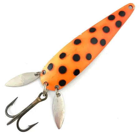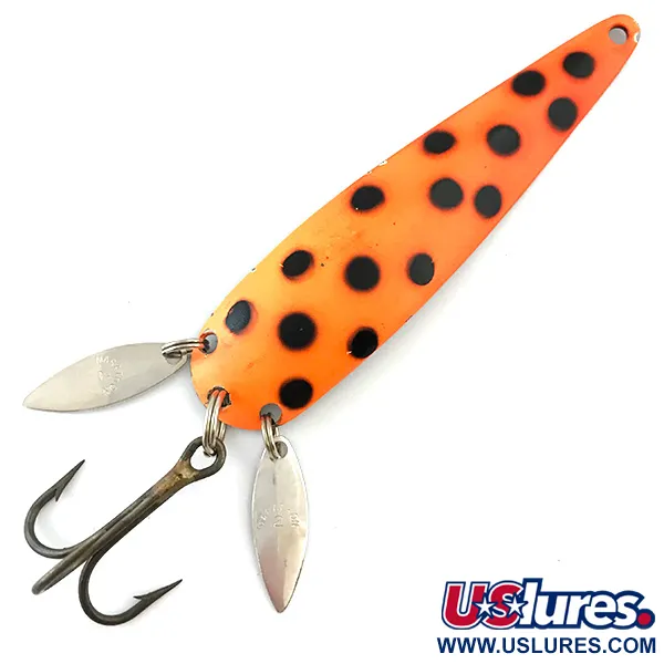 Con un peso de 17 g (3/5 oz), esta cucharilla ondulante vintage está acabada en un atrevido patrón Rojo/Negro/Níquel que atrae la mirada de inmediato. Conocida como Marathon UV, código 5600, cuenta con un par de paletas sonoras de níquel alargadas montadas en las anillas traseras, diseñadas para generar destellos de luz y ocultar el afilado anzuelo triple. Estas paletas especializadas proporcionan un perfil visual distintivo mientras ondean junto al cuerpo de 9,5 cm (3 3/4") de largo. La Marathon Bait Company, un pilar de la fabricación de aparejos en Wisconsin de 1929 a 1979, estampó claramente su sello en la parte posterior de níquel pulido de este ejemplar. Con una calificación de estado de 5/5, el señuelo presenta una superficie excepcionalmente limpia con pintura vibrante y herrajes brillantes libres de corrosión.