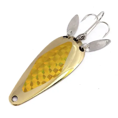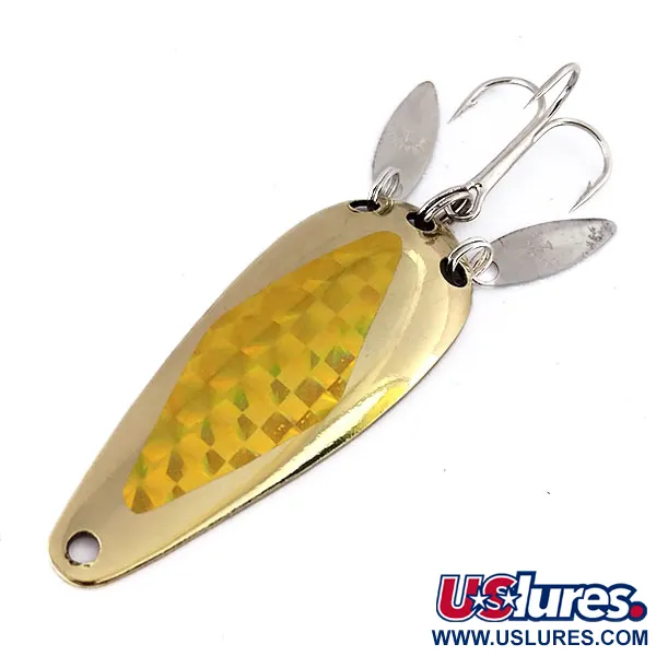 Un chapado en oro cubre el frente de esta cucharilla de lance de 6 cm (2 1/4"), centrada por una incrustación de patrón de escamas amarillas prismáticas que capta la luz desde múltiples ángulos. Dos pequeñas hojas alargadas de tono plateado están montadas en la parte trasera, diseñadas para añadir un destello extra y ocultar el anzuelo triple durante su presentación. En la parte posterior, el nombre Marathon está claramente troquelado en el metal, conectando este señuelo con el legado de la Marathon Bait Company de Wisconsin, un destacado fabricante estadounidense entre 1929 y 1979. Con un peso de 12 g (2/5oz), el señuelo posee un perfil clásico de lágrima muy adecuado para el lance o el curricán. Los herrajes se mantienen brillantes y fuertes, y el acabado general está notablemente bien conservado, obteniendo una calificación de estado de 5/5. Un único orificio de sujeción se sitúa en el extremo estrecho, equilibrado para el peso del cuerpo metálico y el movimiento secundario de las hojas sonoras.