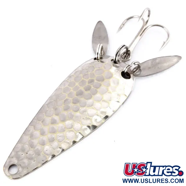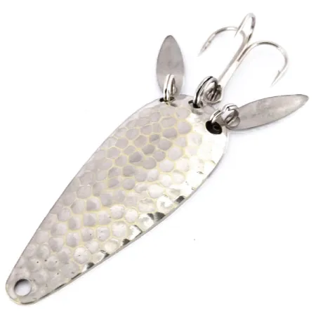 El baño de níquel martilleado capta la luz en la superficie alveolada de esta cucharilla de 6 cm (2 1/4"). Junto al afilado anzuelo triple hay montadas dos pequeñas palas sónicas alargadas que giran sobre anillas abiertas. Estos pétalos adicionales cumplen una función visual específica, ocultando los herrajes y creando la apariencia de una aleta caudal en movimiento. Este ejemplar presenta el sello "MARATHON" estampado en su reverso pulido, un guiño al fabricante de Wisconsin que operó durante cinco décadas a partir de 1929. Con un peso de 12 g (2/5 oz), el señuelo proporciona una densidad significativa para la precisión del lance. Identificada con el código de producto 10044, la cucharilla conserva su brillo original y su integridad estructural, con una calificación de estado de 5/5.