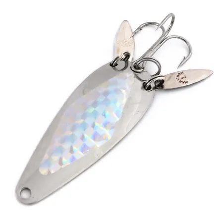 Con un peso de 12 g (2/5 oz), esta cucharilla ondulante niquelada de 6 cm (2 1/4") cuenta con una llamativa lámina holográfica con patrón de diamante en su lado convexo. La Marathon Bait Company, un fabricante de Wisconsin activo entre 1929 y 1979, diseñó este modelo específico (código de producto 10276) con dos "sonic blades" unidas a la anilla abierta trasera. Estas delgadas mini-hojas están destinadas a proporcionar un destello adicional y un movimiento sutil alrededor de la potera, enmascarando eficazmente el aparejo terminal mientras añaden un elemento visual secundario. La parte posterior de la pieza está claramente estampada con el nombre Marathon y muestra un acabado altamente reflectante. Este señuelo se mantiene en condiciones 5/5, conservando su brillo original en las superficies metálicas y el adhesivo multifacético. Las pequeñas hojas secundarias están estampadas con el número 1, indicando su tamaño en relación con el cuerpo principal de la cucharilla.