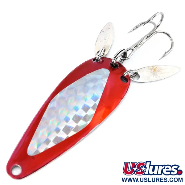 Esta cucharilla Marathon presenta un perfil en forma de lágrima resaltado por un vibrante acabado rojo y un inserto prismático reflectante. Con una longitud de 6 cm (2 1/4") y un peso de 12 g (2/5 oz), el señuelo conserva el legado de la Marathon Bait Company, que operó en Wisconsin entre 1929 y 1979. Un nítido sello «MARATHON» es visible en el reverso de níquel pulido. Este modelo específico, identificado con el código de producto 10363, cuenta con dos pequeñas paletas de hoja de sauce plateadas unidas cerca de la cola. Estas paletas auxiliares proporcionan destellos visuales adicionales cerca del anzuelo triple durante la recogida. El lado frontal muestra una cinta holográfica con patrón de diamante que refleja todo el espectro de luz contra la pintura roja profunda. Todo el herraje, incluidos los anillas abiertas y el triple plateado, se encuentra en excelente estado (calificación 5/5). La cabeza de la cucharilla incluye un orificio limpio para el nudo de la línea o para su uso con un clip.