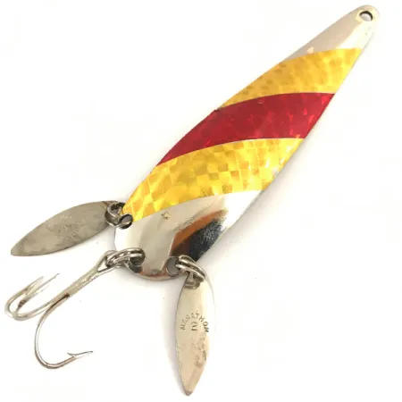 Dos pequeñas palas sonoras alargadas están unidas mediante anillas abiertas cerca de la cola de esta cucharilla de 9,5 cm (3 3/4"), un elemento de diseño característico de Marathon Bait Company. Con el código de producto 4700, este ejemplar pesa 17 g (3/5 oz) y presenta un acabado de níquel brillante en su parte posterior. El lado convexo está cubierto con una cinta prismática texturizada que muestra bandas diagonales alternas de oro y rojo. Producido por el fabricante con sede en Wisconsin que operó de 1929 a 1979, el señuelo está diseñado para que las palas secundarias añadan profundidad visual cerca del anzuelo triple. Esta pieza específica se encuentra en buen estado de conservación, obteniendo una calificación de 4/5 con estampados claros aún visibles en el metal. La parte inferior del cuerpo de la cucharilla está grabada con el nombre Marathon y un indicador de tamaño, a juego con la marca que se encuentra en las palas sonoras individuales.