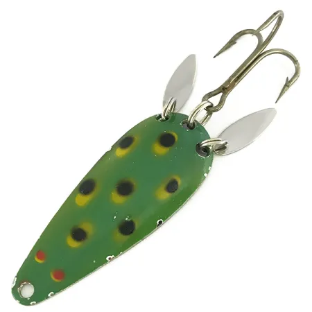 Un vibrante patrón de rana, consistente en audaces manchas negras y amarillas sobre una base verde, define la cara de esta cucharilla ondulante de 12 g (2/5 oz). Identificado con el código de producto 7175, este ejemplar cuenta con dos pequeñas "paletas sonoras" de acabado plateado unidas mediante anillas abiertas cerca del anzuelo triple. Estas paletas especializadas en forma de lágrima están diseñadas para ofrecer destellos visuales y vibración, mientras ocultan parcialmente el herraje terminal. El señuelo mide 6 cm (2 1/4") de largo y lleva un acabado de níquel pulido en su revés, donde el nombre de la marca Marathon está estampado en el metal. Producido por la Marathon Bait Company, un gigante de la fabricación de Wisconsin desde 1929 hasta 1979, este señuelo se mantiene en condición 4/5, mostrando una pintura bien conservada y superficies metálicas limpias. Un simple ojal en el extremo estrecho proporciona el punto de conexión para lance o curricán, mientras que la cola ancha y redondeada sujeta la anilla abierta para el conjunto del anzuelo.