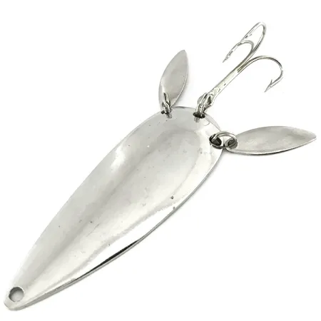 Claramente troquelada en la parte posterior con la marca del fabricante y la inscripción "MADE IN USA", esta muestra exhibe la artesanía de una marca que operó en Wisconsin durante cincuenta años. El acabado de níquel pulido de esta cucharilla de 7,5 cm está en excelente estado, manteniendo una apariencia limpia y brillante que merece una calificación de 5/5. Una característica distintiva del código 7189 es el par de pequeñas "paletas sónicas" alargadas unidas cerca de la cola. Estas paletas auxiliares están situadas flanqueando el anzuelo triple, ofreciendo reflejos de luz adicionales e interés visual al perfil metálico. Con un peso de 17 g, el señuelo está construido con un cuerpo de metal sólido y cuenta con un único orificio de enganche en la nariz afilada. El hardware se completa con un anzuelo triple afilado sujeto con una anilla abierta, lo que ilustra la simplicidad funcional del diseño de Marathon Bait Company.