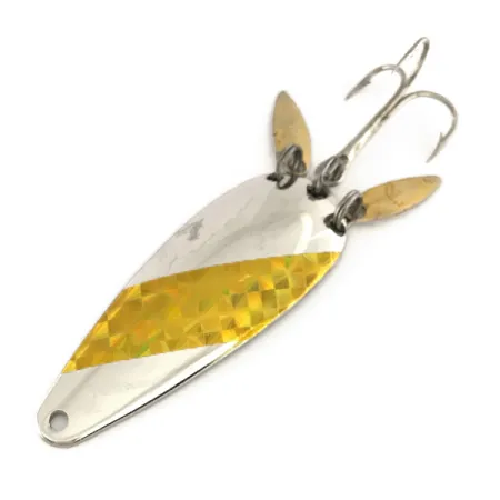 Con una distintiva franja diagonal holográfica dorada sobre su cuerpo de níquel pulido, esta cuchara vintage destaca los diseños creativos de Marathon Bait Company. Con sede en Wisconsin de 1929 a 1979, el fabricante equipó este modelo 7546 con una configuración única de doble pala en la parte trasera. Dos pequeñas palas de estilo hoja de sauce, de color dorado, están unidas a la anilla abierta junto al anzuelo triple, añadiendo puntos extra de reflexión de luz en la cola. Con un peso de 12 g (2/5 oz) y una longitud de 6 cm (2 1/4"), el señuelo se mantiene en excelente estado 5/5, con la cinta reflectante y el acabado metálico extremadamente bien conservados. El reverso del metal estampado muestra una superficie plateada limpia y lisa, característica del equipo de pesca fabricado en EE. UU. en esa época.