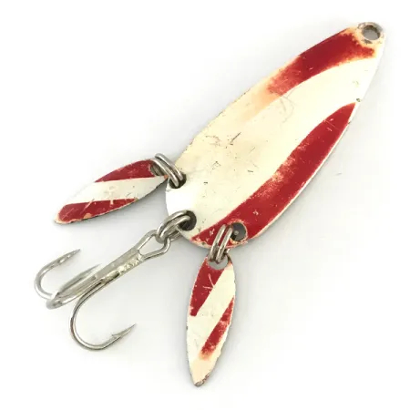 Rayas diagonales rojas y blancas proporcionan un patrón de alta visibilidad en la cara de esta cucharilla ondulante de 4,5 cm (1 3/4"). El nombre de la marca Marathon está troquelado en la parte inferior niquelada, sello de la empresa de Wisconsin que operó entre 1929 y 1979. Este ejemplar se identifica con el código 8200, caracterizado por la inclusión de dos paletas sónicas en la cola. Estas dos pequeñas láminas metálicas alargadas parpadean cerca del anzuelo triple, aportando un brillo extra y ocultando el perfil del anzuelo. Con un peso de 8g (1/4oz), el señuelo está equilibrado para diversas aplicaciones de lanzado. El estado se califica como 4/5, con la pintura mostrando ligeros signos de antigüedad mientras que el acabado de níquel subyacente permanece brillante. Los herrajes firmemente sujetos mantienen las paletas traseras y el triple en su lugar, conservando la configuración original de este equipo fabricado en EE. UU.