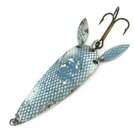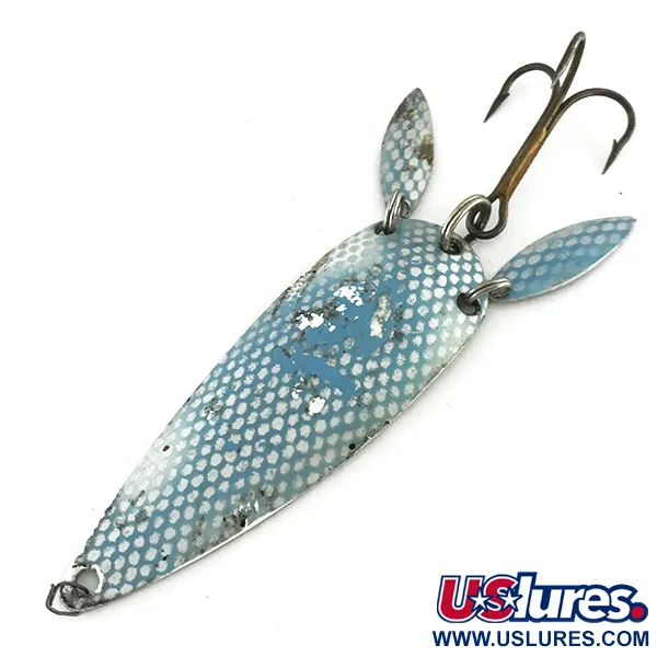 Un vibrante patrón de panal en azul y blanco cubre la superficie frontal de esta cucharilla de 7,5 cm (3"). Identificada con el código de producto 8429, su diseño incorpora dos pequeñas palas sónicas tipo hoja de sauce sujetas mediante anillas abiertas en la parte posterior. Estas palas reflectantes aportan destellos visuales adicionales y ayudan a ocultar el anzuelo triple con acabado en bronce. Con un peso de 17 g (3/5 oz), este señuelo es un diseño clásico de la Marathon Bait Company, que operó en Wisconsin entre 1929 y 1979. El reverso muestra un acabado en níquel pulido donde se aprecian ligeramente las marcas "M-1" y "NAVY". Calificada actualmente con un estado de 4/5, la pintura presenta un desgaste menor pero conserva su característico aspecto texturizado.