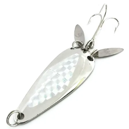 Las superficies niqueladas de esta cucharilla ondulante de 6 cm (2 1/4") presentan un distintivo patrón de rejilla de diamante en un lado, que contrasta con el acabado pulido a espejo del reverso. Procedente de la Marathon Bait Company de Wisconsin, el mayor fabricante de señuelos del estado entre 1929 y 1979, este ejemplar se identifica con el código de producto 8681. Dos palas alargadas de tipo "sonic" están montadas cerca de la potera trasera, diseñadas para captar la luz y proporcionar un movimiento visual similar a la cola de un pez pasto en huida, ocultando al mismo tiempo la punta del anzuelo. Con un peso de 12 g (2/5 oz), el señuelo se conserva en un estado de 5/5. Los herrajes permanecen brillantes, mostrando la calidad de este clásico de fabricación estadounidense a lo largo de sus cincuenta años de historia de producción.