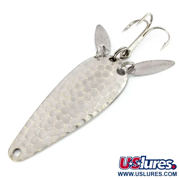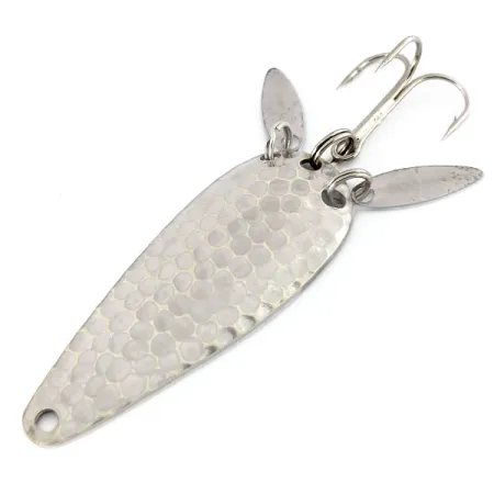El níquel martilleado proporciona una superficie con hoyuelos a esta cucharilla ondulante de 12g (2/5oz), diseñada para capturar y difundir la luz de una manera que las superficies metálicas lisas no pueden lograr. Producido por la Marathon Bait Company, que operó en Wisconsin desde 1929 hasta 1979, este modelo específico 9910 mide 6 cm (2 1/4"). Una característica técnica definitoria es el par de pequeñas y alargadas palas sónicas unidas a las anillas abiertas cerca de la cola. Estas palas cumplen un doble propósito: ocultan parcialmente el afilado anzuelo triple y crean destellos visuales secundarios destinados a imitar el movimiento de la cola de un pez pasto. El lado cóncavo presenta un sello "MARATHON" nítido, que identifica su origen de uno de los fabricantes de aparejos más prolíficos de mediados de siglo del Medio Oeste. Este ejemplar se encuentra en una condición 5/5, manteniendo un acabado brillante y limpio tanto en el cuerpo principal como en los componentes auxiliares. El perfil de lágrima y la distribución del peso son adecuados para técnicas de lanzado o curricán que requieren una silueta metálica.