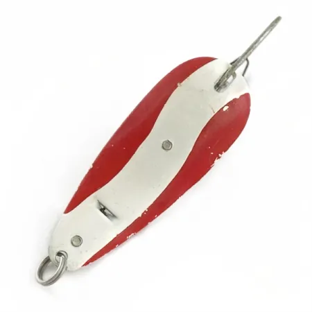 Con una longitud de 5,5 cm (2 1/4"), esta cucharilla metálica presenta un diseño clásico americano con un patrón ondulado característico en rojo y blanco. La Master Weedless Lotta Junior, identificada con el código de producto 23969, es una rareza notable para coleccionistas que valoran los señuelos fabricados en EE. UU. diseñados para coberturas densas. Con un peso de 12 g (2/5 oz), su construcción se basa en un cuerpo remachado robusto que sujeta un anzuelo simple anti-enganche, protegido por un protector de cable para navegar a través de la vegetación espesa. El acabado de la pintura se mantiene brillante y limpio, con una calificación de estado de 5/5 por su excelente conservación. Una anilla abierta de alta resistencia está sujeta en la parte delantera, destacando la durabilidad funcional prevista para este modelo. El reverso metálico refleja la luz, proporcionando un destello de alto contraste contra la superficie superior pintada. Este tamaño junior específico la convierte en una herramienta versátil para buscar el black bass o el lucio en lechos de algas donde las cucharillas convencionales podrían engancharse.
