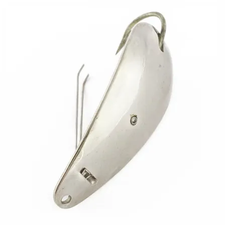 El baño de plata define el perfil estilizado de esta Master Weedless Lotta Junior de 5,5 cm (2 1/4"). Fabricada en EE. UU., su construcción presenta un cuerpo de metal de calibre grueso con un anzuelo simple integrado, diseñado para navegar por coberturas densas. Para evitar enganches, incorpora un par de protectores de alambre flexibles en la base del anzuelo que se extienden hacia la punta. Este artículo concreto, con código de producto 24158, muestra una superficie brillante y bien conservada, acorde con su estado de conservación 5/5. En la parte frontal, un orificio de sujeción perforado con precisión permite el montaje directo o la adición de un emerillón. Su peso de 12 g (2/5 oz) le proporciona una masa considerable para lances a larga distancia. Un pequeño remache y las marcas estampadas en el cuerpo ilustran las técnicas de fabricación de mediados de siglo empleadas por la marca Master.