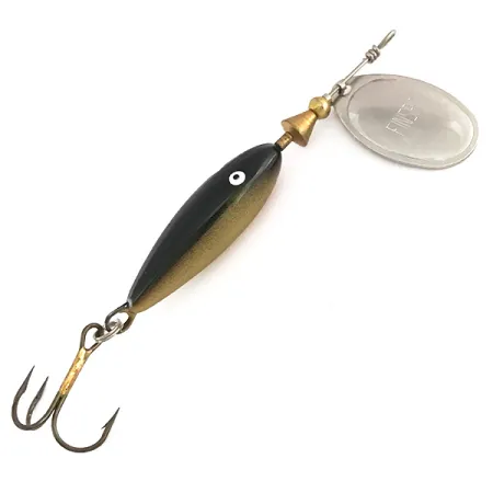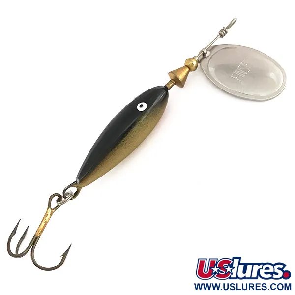 Una hoja plateada con el sello "FIN" es el componente visual principal de este Matzuo FinSpin, código de producto 7891. Con un peso de 1/4 oz (7 g), el señuelo está construido alrededor de un cuerpo lastrado en forma de lágrima con un acabado metálico de bronce y latón. Con una longitud total de 3 1/4" (8 cm), incluye un eje de alambre sólido, un espaciador de cono de latón y una pequeña cuenta metálica para facilitar la rotación de la hoja montada en un estribo. El cuerpo muestra una transición limpia de una sección superior oscura a una parte inferior metálica brillante, acentuada por un punto ocular blanco. Este ejemplar vintage fabricado en EE. UU. está equipado con un anzuelo triple afilado y conserva su brillo original, con una calificación de estado de 5/5.