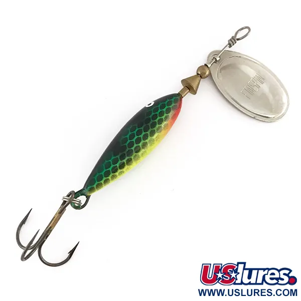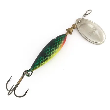 Un vibrante patrón de escamas de panal verde que transiciona hacia reflejos amarillos y negros caracteriza el cuerpo lastrado de este Matzuo FinSpin, identificado por el código de producto 7894. Con una longitud de 8,25 cm (3 1/4"), el diseño presenta una hoja de estilo sauce en tono plateado pulido con el nombre del modelo troquelado, montada sobre una horquilla para su rotación. Con un peso de 7g (1/4oz), el señuelo está construido sobre un robusto eje de alambre con espaciadores de tono latón y un lazo de sujeción superior. El acabado pintado se mantiene nítido con una definición clara en el detalle del ojo, obteniendo una calificación de estado de 5/5. El enfoque de Matzuo en texturas realistas es evidente en la profundidad de la cuadrícula de escamas, que complementa los componentes metálicos reflectantes y el anzuelo triple afilado unido mediante una anilla abierta.