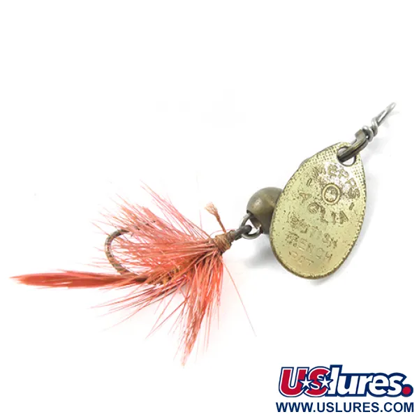 Grabados directamente en la hoja de latón se encuentran los identificadores "BRITISH FRENCH PAT." y el número 0, que marca el tamaño de esta Mepps Aglia 0 Mouche. Este ejemplar, catalogado con el código de producto 1808, pesa 2,5 g (3/32 oz) con una longitud total de 4,5 cm (1 3/4"). El color latón de la hoja ancha es el sello distintivo de los componentes originales franceses diseñados por Andre Meulnart, a pesar de que este señuelo fue ensamblado en los EE. UU. Su cola de plumas presenta un adorno de color naranja rojizo hecho de pelo de ardilla y ciervo, acentuado con plumas de pavo. En cuanto a los herrajes, su estado es un respetable 4/5, con el ojal envuelto en alambre y el cuerpo de cuentas en un estado limpio y funcional. Un sistema de rotación de cono preciso está integrado en la estructura, con el fin de permitir que la hoja gire suavemente según la corriente del agua o la velocidad de recogida. Este diseño ha sido un elemento básico para los pescadores de truchas y peces de río desde la década de 1930, utilizando las vibraciones específicas creadas por la forma ancha de la hoja para atraer a los peces.