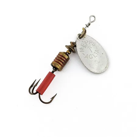 El estampado en el reverso de la pala indica claramente "MADE IN FRANCE", haciendo referencia a los orígenes del diseño de Andre Meulnart en 1938. Esta Mepps Aglia 1, catalogada bajo el código de producto 22331, cuenta con una pala plateada que genera destellos intensos. Con un peso de 1/8 oz (3,5 g) y una longitud total de 2 1/4" (5,5 cm), tiene un tamaño versátil para la pesca de truchas o peces de pequeña talla. El cuerpo de latón está realzado con franjas rojas horizontales, aportando un contraste sutil con el armazón metálico. En el anzuelo triple se encuentra el característico canutillo de plástico rojo, un elemento habitual para provocar la picada. Este ejemplar recibe una calificación de estado de 5/5, ya que el acabado plateado y los componentes se mantienen excepcionalmente limpios y bien conservados.
