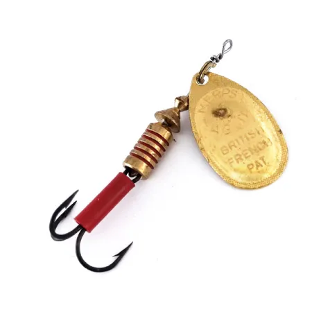 En la hoja con acabado dorado está grabada la marca 'British French Pat.', un guiño a la larga herencia internacional de esta Mepps Aglia 3. Con un peso de 7g (1/4oz) y una longitud de 7cm (2 3/4"), este ejemplar específico cuenta con una funda de plástico roja vibrante sobre la tija del anzuelo triple, proporcionando un claro contraste visual con el metal. El reverso de la hoja lleva los sellos 'For Breck's Canada' y 'Made in France', identificando su distribución a través del importador canadiense que ayudó a popularizar el diseño de Andre Meulnart de 1938. El cuerpo de latón macizo está detallado con profundas estrías horizontales, que proporcionan el peso necesario para el lance y sirven como anclaje para el estribo cónico. Cada componente de esta cucharilla en estado 5/5, desde las formas de alambre de latón hasta el chapado en oro pulido, refleja la construcción duradera que convirtió a estas cucharillas en estándares mundiales. Este código de producto 10079 representa el diseño Aglia de tamaño medio, frecuentemente utilizado para capturar truchas grandes, black bass o lucios.