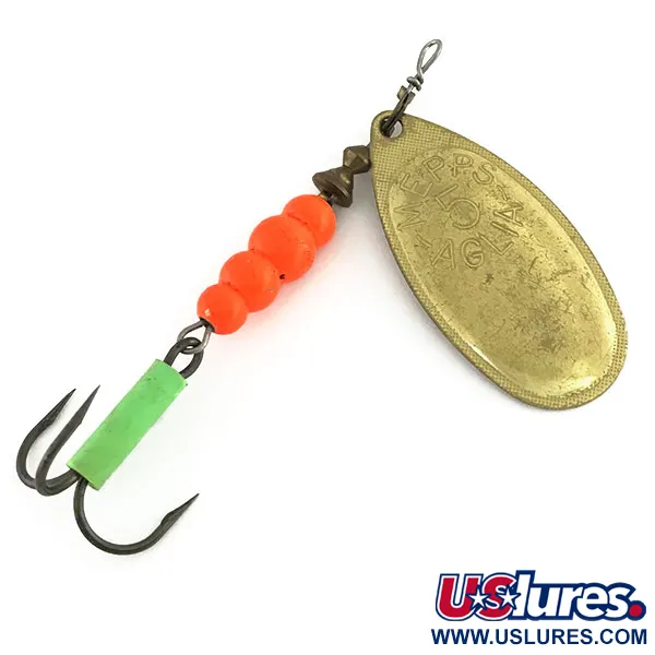 Con un peso de 14 g (1/2 oz), esta cucharilla está construida alrededor de una hoja dorada de tamaño 5 que lleva el sello clásico de sus orígenes franceses. El armazón de 8 cm (3 1/4") cuenta con un cuerpo de tres cuentas naranjas fluorescentes que, junto con la funda verde en el anzuelo triple, reaccionan intensamente a la luz UV. Este ejemplar específico, catalogado con el código 9322, representa la evolución moderna del diseño original de Andre Meulnart de 1938, ensamblado en los EE. UU. con componentes franceses. El hardware está en excelente estado (5/5), con un acabado dorado impecable en la hoja ancha Aglia y superficies sin marcas en el cuerpo de cuentas. Un estribo especializado permite que la hoja gire alrededor del eje central, mientras que el tubo verde de alto contraste proporciona un objetivo visual claro en la base del señuelo.