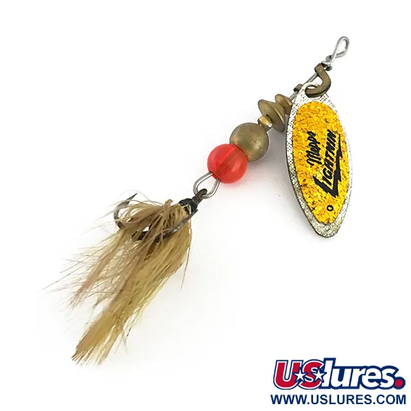 La purpurina dorada aporta textura a la hoja de níquel de este ejemplar, ofreciendo un perfil visual distintivo muy buscado por los coleccionistas de los diseños Mepps. Con una longitud total de 5 cm (2") y un peso de 3 g (3/32 oz), esta cucharilla giratoria muestra la ingeniería de precisión de los componentes franceses originales. La hoja lleva estampadas las marcas "AGLIA LONG 0" y "MADE IN FRANCE" en el reverso, mientras que el montaje incluye la clásica cuenta roja traslúcida y los espaciadores de latón que han definido la marca durante décadas. Esta variante específica, identificada con el código de producto 8809, combina un acabado texturizado de oro sobre plata con un montaje de plumas naturales en el anzuelo triple. La cola de plumas y los herrajes se mantienen en un estado excepcional, lo que justifica una calificación de estado de 5/5 para este ejemplar bien conservado. Su ligereza la convierte en una opción ideal para lanzar en zonas poco profundas donde una presentación sutil es fundamental.