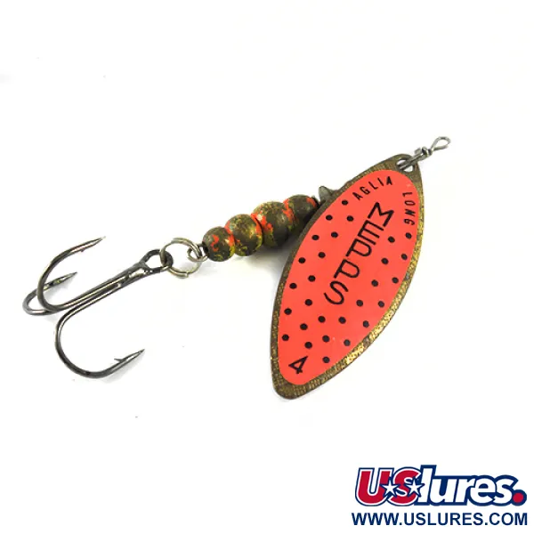 Con un peso de 17 g (3/5 oz), esta cucharilla giratoria vintage está construida alrededor de la icónica hoja de sauce característica de la serie Aglia Long. La hoja presenta una cara naranja fluorescente vibrante con puntos negros y la marca clásica de Mepps, incluyendo el tamaño 4 troquelado en la base. El código de producto 1703 representa una parte de la historia de la pesca, con componentes fabricados en Francia y ensamblados en los EE. UU. Su cuerpo lastrado consiste en cuentas texturizadas terminadas en un patrón de camuflaje verde tierra y naranja, que remata en un anzuelo triple afilado. Con una longitud de 8 cm (3 1/4"), el armazón en tono latón proporciona el peso necesario para el lance o para recogidas en aguas profundas. Este ejemplar se encuentra en una condición 4/5, mostrando un acabado bien conservado y superficies metálicas limpias.