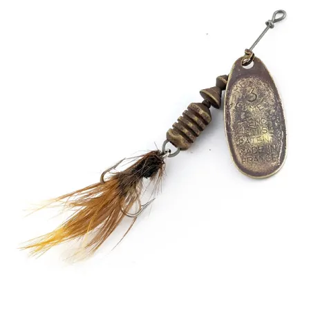 Grabada claramente en la pala de latón con el icónico "3 COMET" y las marcas de patente franco-británicas, esta cucharilla de mediados de siglo refleja la historia transatlántica de la marca Mepps. Con un peso de 1/4 oz (6,5 g), el señuelo presenta un diseño modular donde su armazón de alambre de 7 cm permite cambios rápidos del anzuelo triple con plumas. Estos componentes específicos se fabricaron en Francia y se ensamblaron posteriormente en los EE. UU., una práctica habitual durante la década de 1960 que definió la era del modelo 20052. El cuerpo de latón está compuesto por un distintivo barril estriado y un espaciador cónico, mostrando un carácter auténtico que le otorga una calificación de estado de 3/5. El anzuelo conserva su montaje original de plumas en colores marrón y jengibre, proporcionando un perfil natural. Este ejemplar demuestra la clásica geometría de pala francesa diseñada para ofrecer versatilidad en lances y recogidas.