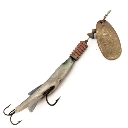 Esta muestra fue ensamblada en EE. UU. durante la década de 1970 con componentes de fabricación francesa. Con un peso de 12g (2/5 oz) y una longitud de 12cm (4 3/4"), esta cucharilla giratoria del número 4 cuenta con una hoja de latón que luce un sello de patente británica (British Patent). El cuerpo consta de anillos de latón pintados de rojo que dan paso a un pez de vinilo blando en tonos plateados. Identificada con el código 12642, el señuelo se encuentra en un estado 4/5, con un acabado limpio en las piezas metálicas y una sección de plástico blando bien conservada. El montaje incluye un anzuelo simple ventral prominente y una potera afilada en la cola.