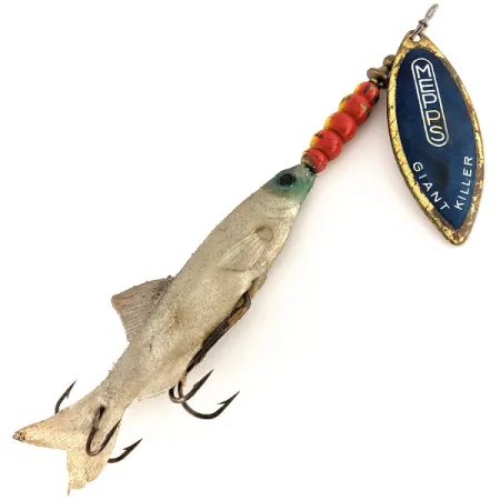 Un peso sustancial de 40 g (1 1/3 oz) ancla esta cucharilla giratoria de alta resistencia, que mide 17 cm (6 3/4") de longitud total. La hoja 'Giant Killer' destaca por su cara recubierta de azul con letras blancas, mientras que el reverso muestra el acabado de latón natural. El apilamiento de perlas rojas y amarillas en el eje de alambre crea un contraste brillante antes de encontrarse con el cuerpo de vinilo. Identificada con el código de producto 12474, esta cucharilla representa un periodo en el que los componentes fabricados en Francia se ensamblaban en los EE. UU. para el mercado norteamericano. El cuerpo de escamas plateadas está acentuado por un ojo de color cerceta y alberga anzuelos de acabado oscuro. Calificado con un estado de 4/5, el espécimen muestra ligeros signos de almacenamiento y un uso honesto en las superficies metálicas. Los anzuelos triples de acabado oscuro están situados a lo largo del vientre y la cola del cuerpo blando.