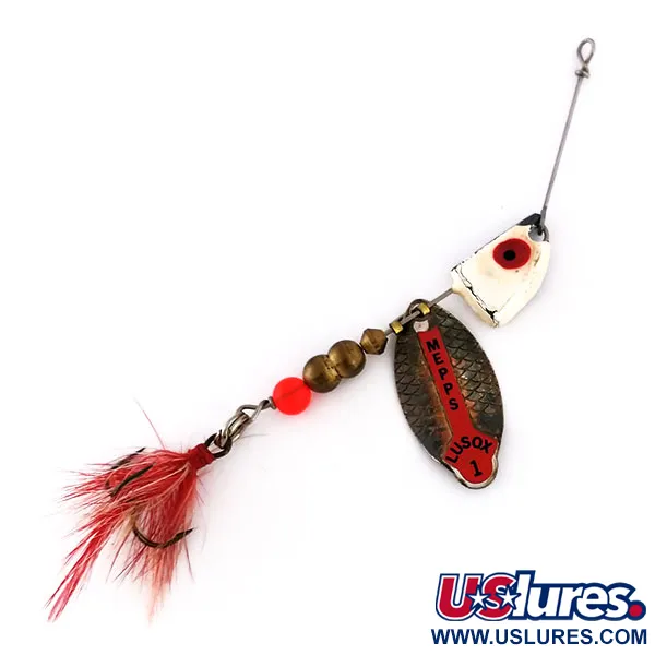Una hoja de color latón con una prominente calcomanía roja y la inscripción 'MEPPS LUSOX 1' identifica este ejemplar fabricado en EE. UU. Con una medida de 7,5 cm (3") y un peso de 10 g (1/3 oz), su construcción se centra en un robusto eje de alambre. El montaje incluye una cabeza plomada acabada en blanco y negro con un distintivo ojo rojo, seguida de tres cuentas de latón y una cuenta espaciadora de color naranja vibrante. Una potera con plumas rojas está sujeta en la parte posterior, añadiendo un elemento visual suave al perfil metálico. Con una calificación de estado de 4/5, los detalles pintados y las superficies metálicas se mantienen bien conservados, mostrando solo ligeros signos de antigüedad. Este modelo, identificado con el código 10198, utiliza el clásico diseño de cabeza intercambiable característico de la serie Lusox, diseñado para facilitar la pesca en diferentes profundidades.