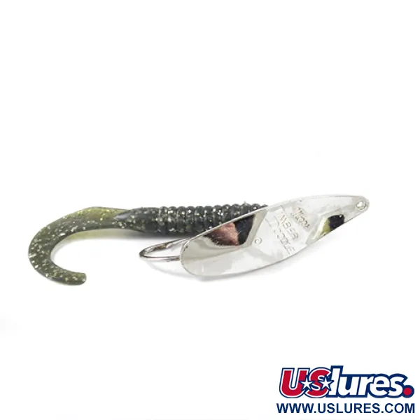 Con un peso de 8g (1/4oz), esta cuchara antialgas ofrece la masa suficiente para lances de precisión en coberturas densas de la orilla. El acabado de níquel pulido en la paleta proporciona un destello clásico que refleja la luz de manera efectiva en la columna de agua. Esta Mepps Timber Doodle 0, identificada con el código de producto 2778, mide 5cm (2") de largo y viene emparejada con su tráiler de plástico blando original en color verde oliva oscuro. El tráiler está cargado de purpurina dorada y plateada, añadiendo una capa de textura visual al conjunto. Diseñada específicamente para pescar entre vegetación espesa, la cuchara cuenta con un protector de maleza de alambre integrado que evita que la punta del anzuelo se enganche en la madera sumergida. La fabricación estadounidense es evidente en el estampado nítido en la parte posterior del cuerpo metálico. Este señuelo en particular se mantiene en excelente forma con una calificación de estado de 4/5, mostrando una superficie de níquel muy bien conservada.