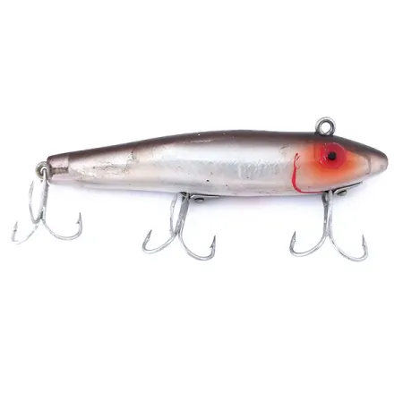 Un peso de 1/2 oz (14 g) proporciona a este L&S Bait MirrOlure 52M 27 Original la densidad necesaria para un twitchbait hundido diseñado para alcanzar capas de agua más profundas. Identificado por el código de producto 10997, el señuelo presenta el perfil de color M27, que consiste en un cuerpo de escamas plateadas, un lomo oscuro y una prominente cabeza roja con pupila oscura. Con una longitud de 3 3/4 pulgadas (9,5 cm), el montaje cuenta con tres anzuelos triples plateados sujetos por herrajes reforzados de tornillo y placa típicos de la fabricación estadounidense de mediados de siglo. El vientre está marcado con un sello rojo '52M27' bien definido, que destaca sobre la parte inferior pálida. Este ejemplar se encuentra en una condición 4/5, mostrando signos muy leves de antigüedad mientras mantiene un acabado suave y limpio en el cuerpo de plástico. Diseñado tanto para lance como para curricán, fue fabricado originalmente para soportar los ataques agresivos de salmón, lucio y lucioperca americana. El punto de enganche se sitúa en la parte superior de la cabeza para facilitar su orientación de hundimiento durante la recogida.