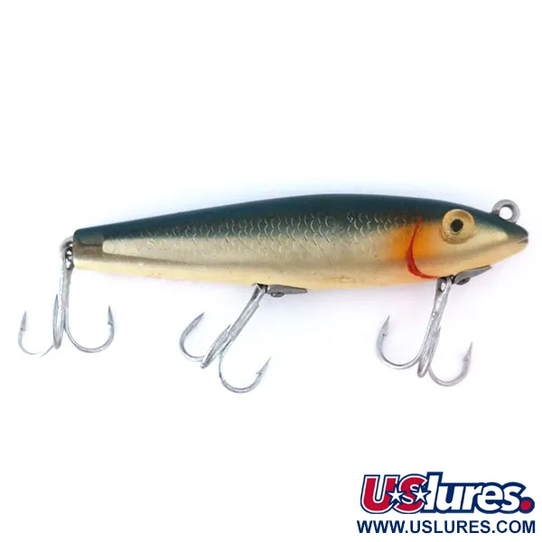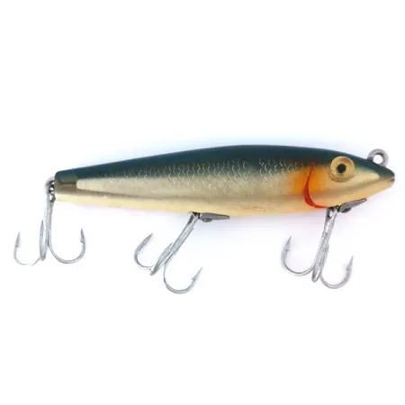 Los costados con patrón de escamas en un rico acabado dorado definen la estética de este L&S Bait Mirrolure 7M24, un clásico walker de superficie de los EE. UU. Con una longitud de 11 cm (4 1/4") y un peso de 11 g (2/5 oz), este modelo específico presenta un lomo azul verdoso profundo que transiciona a costados metálicos texturizados, acentuados por una marca de agalla roja brillante cerca de la cabeza. Los ojos amarillos grandes y prominentes están situados justo debajo del enganche de línea superior, una característica de diseño típica de la serie 7M destinada a una presentación en superficie a 0 m. Equipado con tres anzuelos triples afilados, los componentes se mantienen brillantes y funcionales. Este espécimen, con código de producto 10990, muestra un excelente estado de conservación, con una calificación de 5/5. Los coleccionistas apreciarán el patrón de color M24, un básico para la pesca de black bass, lucio y trucha mediante lance o curricán. Su perfil esbelto en forma de cigarro está diseñado para mantenerse alto en la columna de agua.