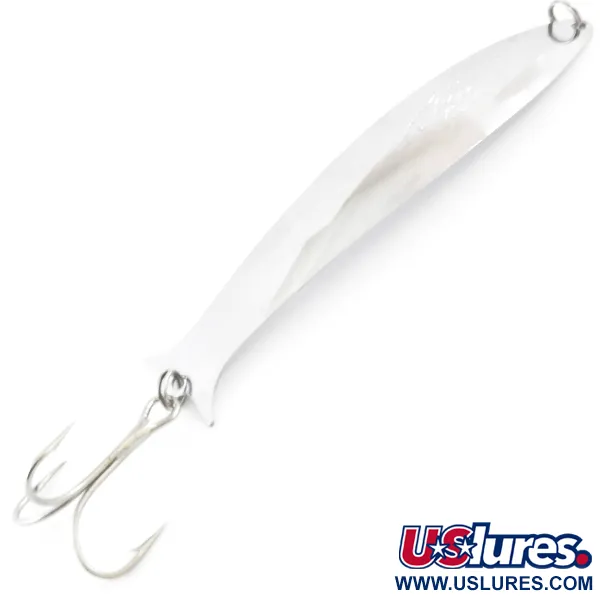Un baño de plata pulida refleja la luz a lo largo de los 9,5 cm (3 3/4") de este clásico de fabricación canadiense. Con un peso de 1/3 oz (10 g), el Mooselook wobbler de Williams es un señuelo fundamental para quienes frecuentan las profundas aguas del norte, diseñado con una distintiva cresta longitudinal que le otorga su forma rígida y esbelta. Este ejemplar específico, con código de producto 4074, luce el legendario chapado en metales preciosos de Williams en estado 5/5, tan brillante como el día en que fue fabricado. El perfil alargado de pez pasto se estrecha hacia una cola ensanchada donde se monta un anzuelo triple afilado. Principalmente una herramienta para curricán, su funcionamiento se basa en el equilibrio entre el peso del metal estampado y la resistencia del agua contra sus superficies curvas. El nombre Mooselook estampado en la cara plateada es una marca de calidad de una firma centrada en acabados de alta visibilidad desde principios del siglo XX. Un sencillo anilla abierta en la cabeza sirve como punto de sujeción para el bajo de línea.
