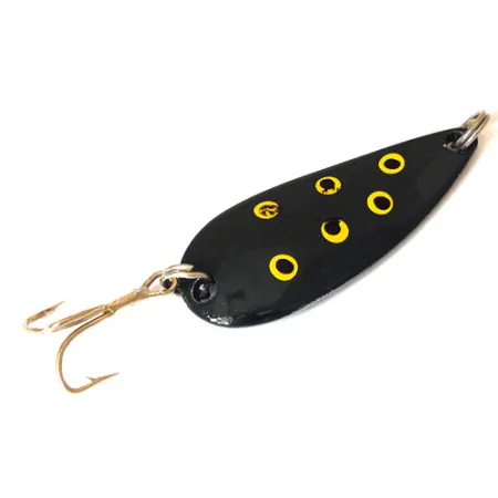 Con un peso de 11 g (2/5 oz), esta cucharilla Moriyama ofrece la densidad necesaria para alcanzar objetivos profundos durante el lance. Originaria de Japón, esta muestra está acabada en un patrón de alto contraste denominado Frog, que presenta una parte superior negra sólida decorada con cinco círculos amarillos bien definidos. Con una longitud de 5 cm (2"), su cuerpo metálico en forma de lágrima cuenta con un reverso de níquel pulido que proporciona un brillo metálico intenso. Este ejemplar específico, con código de producto 0902, se encuentra en un estado de conservación 4/5, con solo un ligero desgaste superficial propio de su antigüedad. Viene equipada con un anzuelo triple bronceado sujeto mediante una anilla abierta, además de otra anilla en la parte delantera para asegurar la línea.