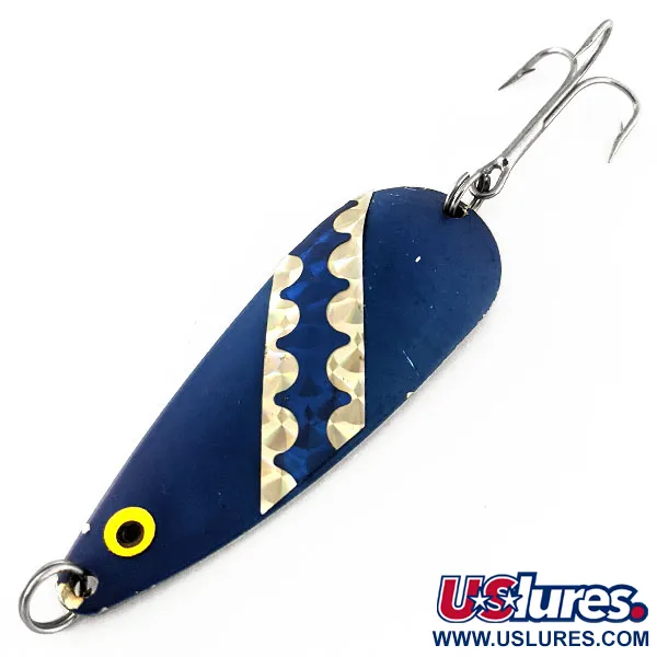 Un contraste llamativo entre el azul mate profundo y la cinta metálica reflectante define a esta cucharilla ondulante de fabricación japonesa. Con un peso de 25g (1oz) y una longitud de 7cm (2 3/4"), el señuelo presenta un distintivo acabado azul texturizado en su superficie convexa, dividido por un inserto holográfico ondulado con patrón de escamas. Un prominente ojo amarillo con pupila negra está situado cerca de la parte frontal, proporcionando un punto focal de alto contraste sobre el fondo azul oscuro. El reverso cóncavo de la cucharilla Moriyama muestra un acabado de níquel pulido, que resalta el trabajo limpio del metal propio de las exportaciones japonesas antiguas. Registrado bajo el código 11433, el ejemplar se encuentra en un estado 5/5, mostrando un alto nivel de conservación donde el recubrimiento texturizado y la cinta decorativa permanecen impecables. El hardware consta de un robusto anzuelo triple y anillas abiertas tanto en la punta como en la cola para un montaje seguro.
