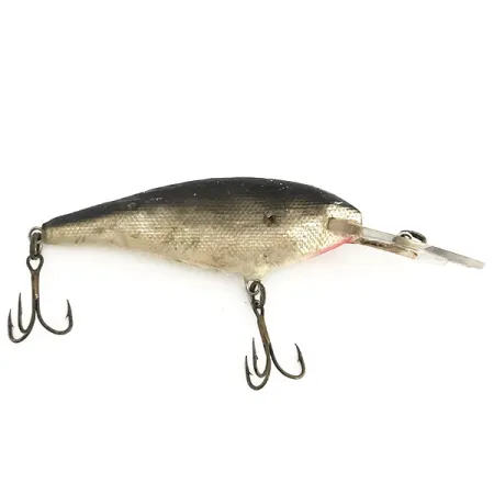 Con un peso de 9 g (1/3 oz), este señuelo Moriyama fabricado en Japón presenta un perfil clásico de profundidad diseñado para alcanzar hasta 3,5 m (11,5 ft). El cuerpo plateado de 9 cm (3 1/2") presenta un patrón de escamas texturizado que transiciona hacia un lomo oscuro en contraste y un sutil detalle rojo en la garganta. Con una calificación de 3/5, la pieza muestra señales evidentes de uso en el agua, incluyendo una marca circular de los anzuelos visible en el flanco y una pequeña grieta cerca del enganche del anzuelo. Identificado con el código de producto 9160, el señuelo conserva sus anzuelos triples originales y un babero de profundidad grande y transparente. El acabado plateado tiene un aspecto suave y envejecido que resalta el intrincado detalle de las escamas en los costados del cuerpo.