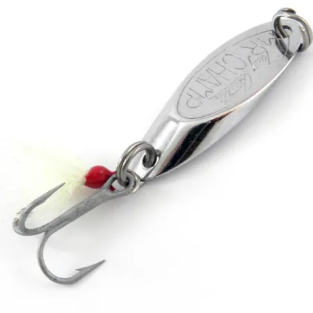 Grabadas profundamente en el cromado pulido, las letras "MR CHAMP" y "Tony Accetta" identifican esta cucharilla ondulante de 8g (1/4oz) como una pieza esencial del equipo de pesca estadounidense. Con una longitud de 4 cm (1 1/2"), el código de producto 3846 corresponde a la variante con plumas de este diseño, que incluye un triple con plumas blancas. Una pequeña y llamativa cabeza roja remata el atado de las plumas, creando un contraste con el brillo plateado del cuerpo. Este ejemplar se encuentra en excelente estado (calificación 5/5) y parece no haber sido usado, sin signos de desgaste en las anillas abiertas reforzadas ni en el acabado de alto brillo. El cuerpo de metal macizo está perfilado para el lanzado y, en el reverso, se aprecia claramente una pegatina identificativa. El penacho de plumas está firmemente sujeto y el anzuelo triple original se mantiene afilado y estructuralmente sólido.