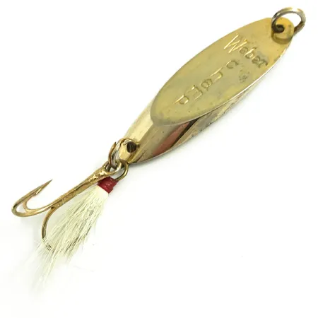 Estampado claramente en el cuerpo de metal pulido de 14g (1/2oz), el nombre Weber identifica a este MrChamp como una parte del patrimonio de pesca estadounidense de una empresa con un siglo de historia en USA y Canadá. Este ejemplar dorado de 5cm (2"), identificado con el código 6068, representa el diseño anterior a la integración de la marca en la gama de Luhr Jensen. Su estado es excepcionalmente limpio, con una calificación de 5/5 por el brillo preservado de su acabado. El extremo posterior está equipado con un anzuelo triple con plumas, que incluye pelo blanco asegurado por una tradicional vuelta de hilo rojo. Una anilla abierta reforzada en la punta proporciona un punto de conexión sólido para lances o jigging.