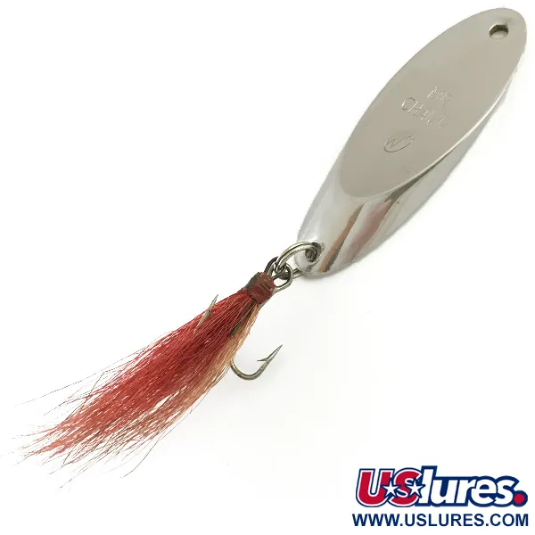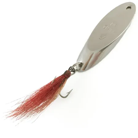 Con un peso de 21 g (3/4 oz), esta cucharilla ondulante niquelada representa el periodo temprano de fabricación estadounidense de la empresa Weber antes de que el modelo fuera adquirido por Luhr Jensen. El cuerpo de 6 cm (2 1/4") presenta un acabado de Níquel brillante y reflectante que aún se encuentra en un estado 5/5, lo que demuestra el alto nivel de cuidado dado a este señuelo vintage. En el metal está grabado claramente el nombre MrChamp, junto con el código de producto 6130 que denota esta configuración específica con plumas. El anzuelo simple está vestido con un tráiler de pelo rojo atado a mano, sujeto firmemente con un hilo oscuro. Diseñado como un señuelo de lanzado versátil, su construcción sólida y su herencia de EE. UU. lo convierten en una pieza fundamental para cualquier colección de artículos de pesca de mediados de siglo.