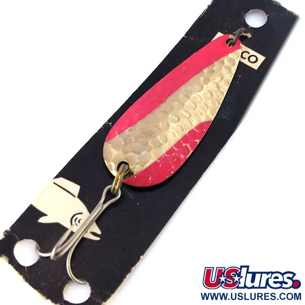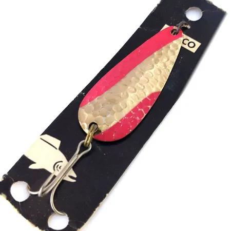 Una textura de oro martilleado forma el centro de esta cucharilla vintage, bordeada por secciones de pintura rosa brillante. Con un tamaño de 5,5 cm (2 1/4") y un peso de 10 g (1/3 oz), el Nebco FlashBait 266 es un señuelo clásico fabricado en Estados Unidos. Bajo luz ultravioleta, las franjas rosas muestran un brillo distintivo, un detalle técnico diseñado para aumentar la visibilidad en aguas profundas o turbias. Este ejemplar específico, identificado con el código de producto 10798, está sin usar y permanece sujeto a su cartón original de color negro. El equipo consta de un anzuelo triple sujeto por un largo clip de alambre en la cola.