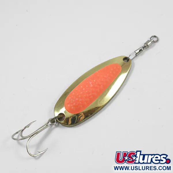 Con un peso de 1/2 oz (14 g), esta cucharilla está diseñada per lograr grandes distancias de lanzado, incluso con vientos costeros. El cuerpo de latón de gran grosor con acabado dorado destaca por un inserto de color naranja vibrante que imita un huevo de salmón con textura granulada, un diseño pensado para provocar la picada de salmones y truchas arcoíris. En la parte inferior lleva grabado claramente "Nebco Pixee Pat. No. 40 1/2 oz USA", marcando su origen y modelo específico bajo el código de producto 1949. Con una longitud de 5,5 cm (2 1/4"), la cucharilla está equipada con herrajes originales, incluyendo un anzuelo triple resistente y un esmerillón de barril en la parte superior para minimizar la torsión de la línea. Este ejemplar mantiene una calificación de estado de 4/5, mostrando un acabado bien conservado que sigue siendo muy reflectante. Su construcción permite movimientos de tumbos y balanceos en los pozos profundos de los ríos o una oscilación constante durante la recogida en lagos. Este señuelo versátil se utiliza a menudo para alcanzar peces depredadores como el lucio, el muskellunge y el black bass a distintas profundidades.