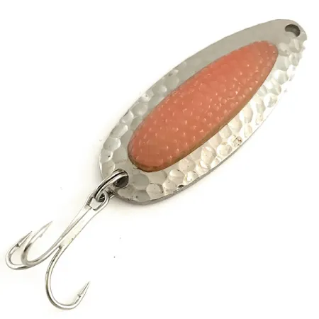 Un cuerpo de latón de gran calibre que pesa 1/2 oz (14 g) permite que esta cucharilla Nebco se lance como una bala y alcance pozas profundas en ríos de corriente rápida. El cuerpo de 2 1/4" (5.5 cm) está chapado en níquel martilleado, ofreciendo una superficie texturizada que genera destellos significativos incluso en aguas tomadas. En su centro se encuentra un inserto que simula un huevo de salmón en tono marrón, un elemento visual específico diseñado para provocar el ataque de salmónidos y otros peces de presa. Con el código de producto 6462, el señuelo está en condición 5/5, mostrando un acabado limpio y de alta calidad tanto en el metal como en el inserto de plástico. Está equipado con un anzuelo triple afilado y un robusto anclaje, lo que garantiza durabilidad durante el uso intensivo tanto en agua dulce como salada. Ya sea al curricán en lagos o lanzada en las rompientes costeras, el diseño permite movimientos erráticos, de balanceo y de rotación que la han convertido en un básico en muchas cajas de pesca. Un único orificio en la parte superior proporciona una conexión segura para un esmerillón con broche para optimizar la presentación del señuelo.